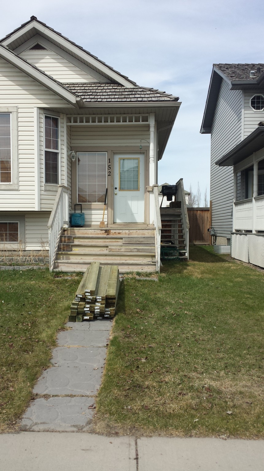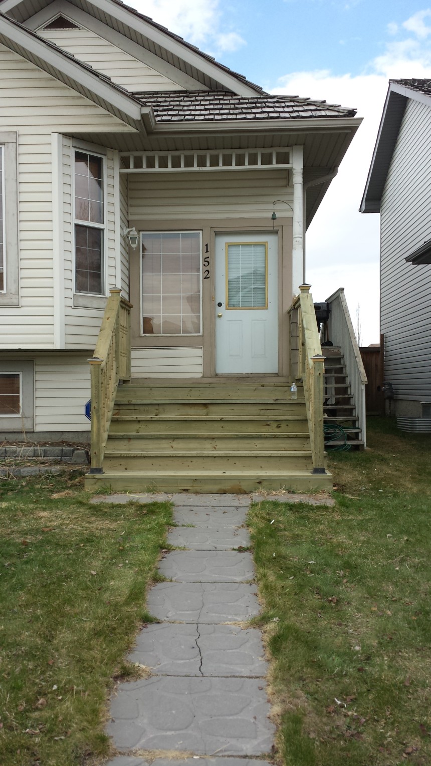 Stair Replacement: Removal of the old, deteriorating front steps and construction of a brand-new, wider set of wooden stairs using treated lumber.